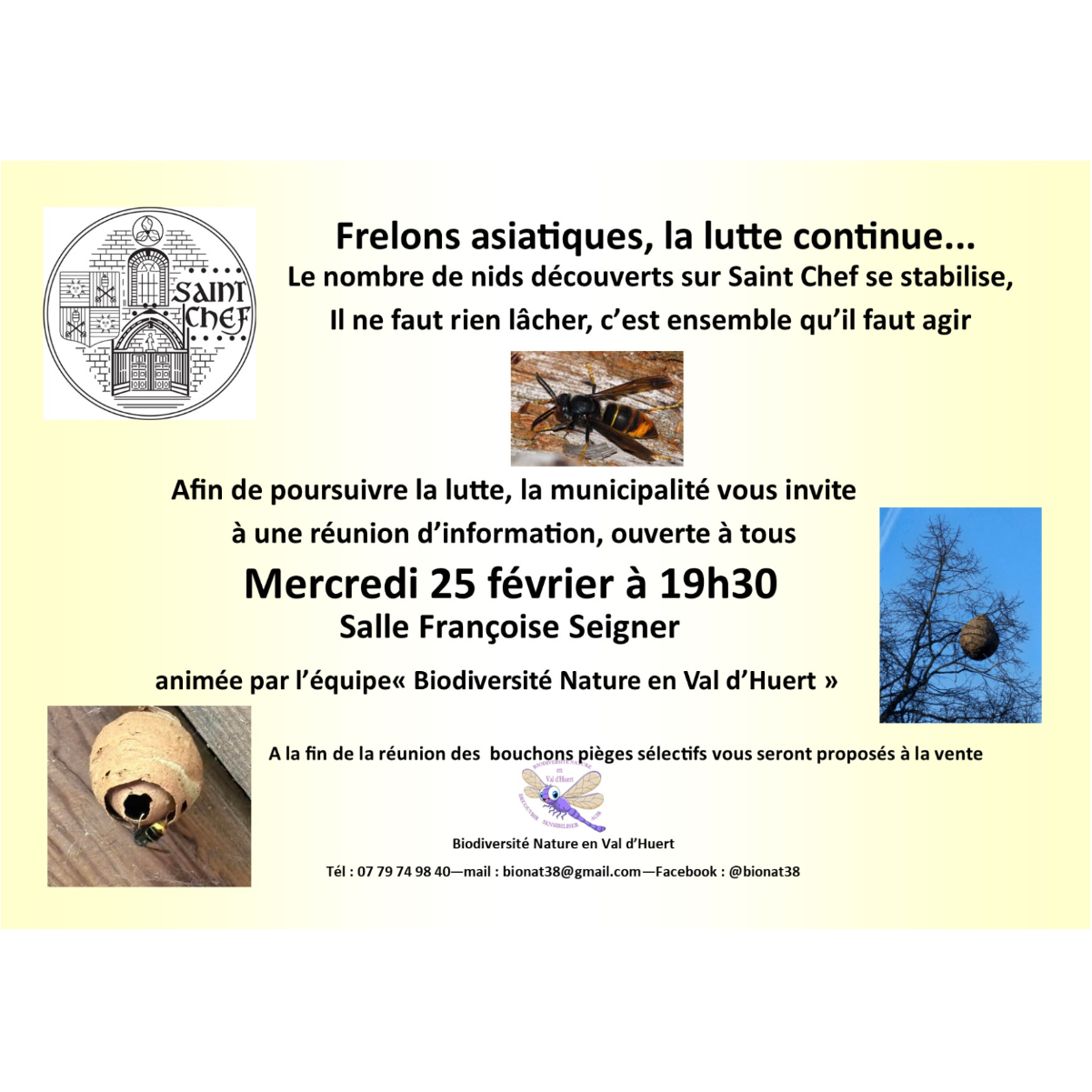 L'association Biodiversité Nature en Val d'Huert, partenaire de notre commune vous invite à réunion publique d'information intercommunale sur le cycle de vie du frelon asiatique, et la présentation des zones à surveiller pour la campagne de piégeage printanier pour les communes de St Chef, St Hilaire de Brens et Vignieu.